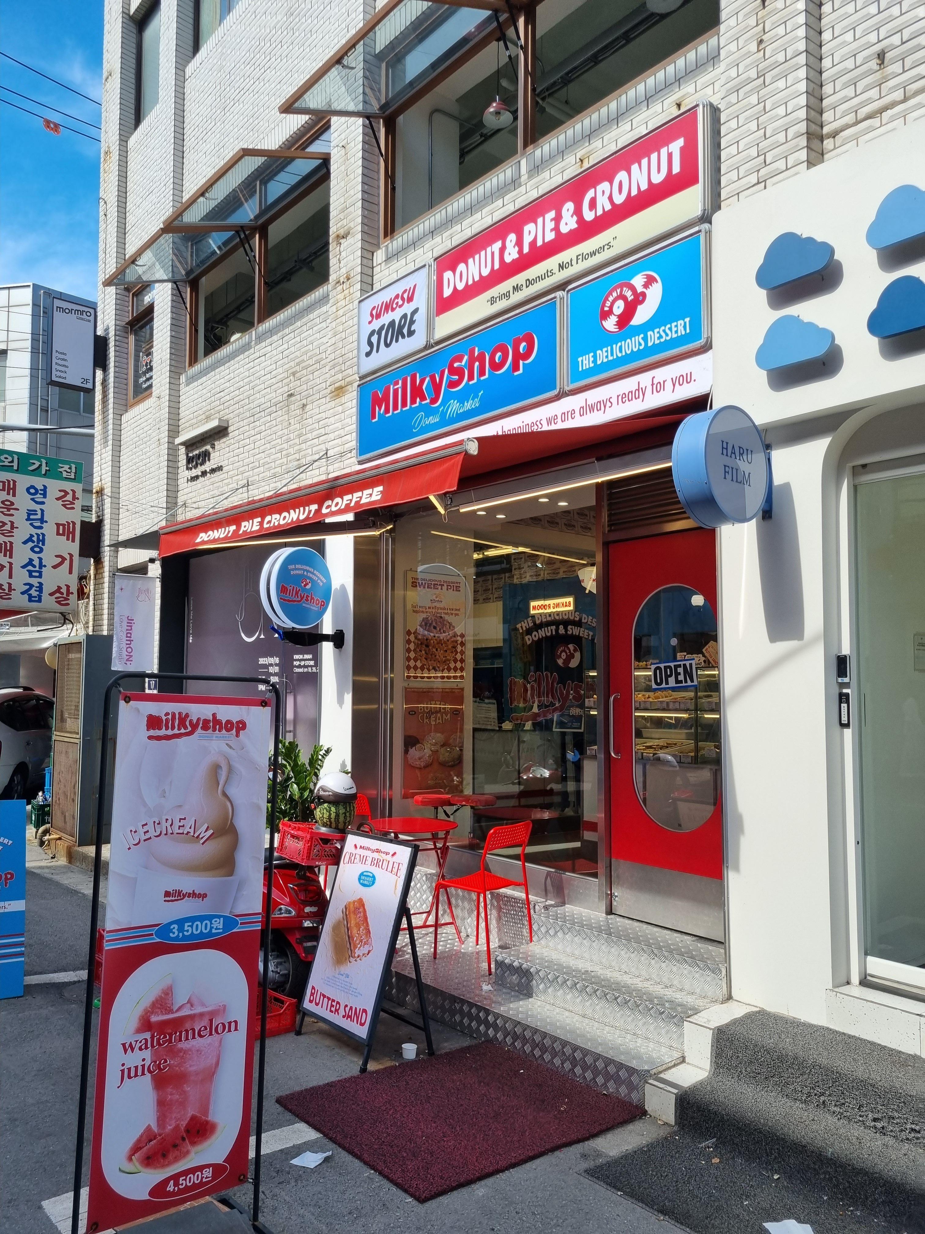 성수 밀키샵 Milky shop. 성수동 디저트 도넛을 파는 가게이다. 가게의 평수는 넓지 않지만 간판과 인테리어는 마치 미국의 도넛 가게에 온 듯한 힙한 느낌을 준다. 매일 아침 도넛, 파이, 크로넛, 페이스츄리 꽈베기, 버터 센드 등을 직접 구워 판매한다. 밀키샵 Milky Shop은 '당일 생산, 당일 판매'라는 구호 아래 도우 발효, 크림 생산, 반죽까지 모두 직접 이루어지고 있다. 아메리카노, 라떼, 소프트 아이스크림도 함께 판매하고 있으니 성수 핫플 카페를 찾는다면 방문하면 좋은 곳이다.