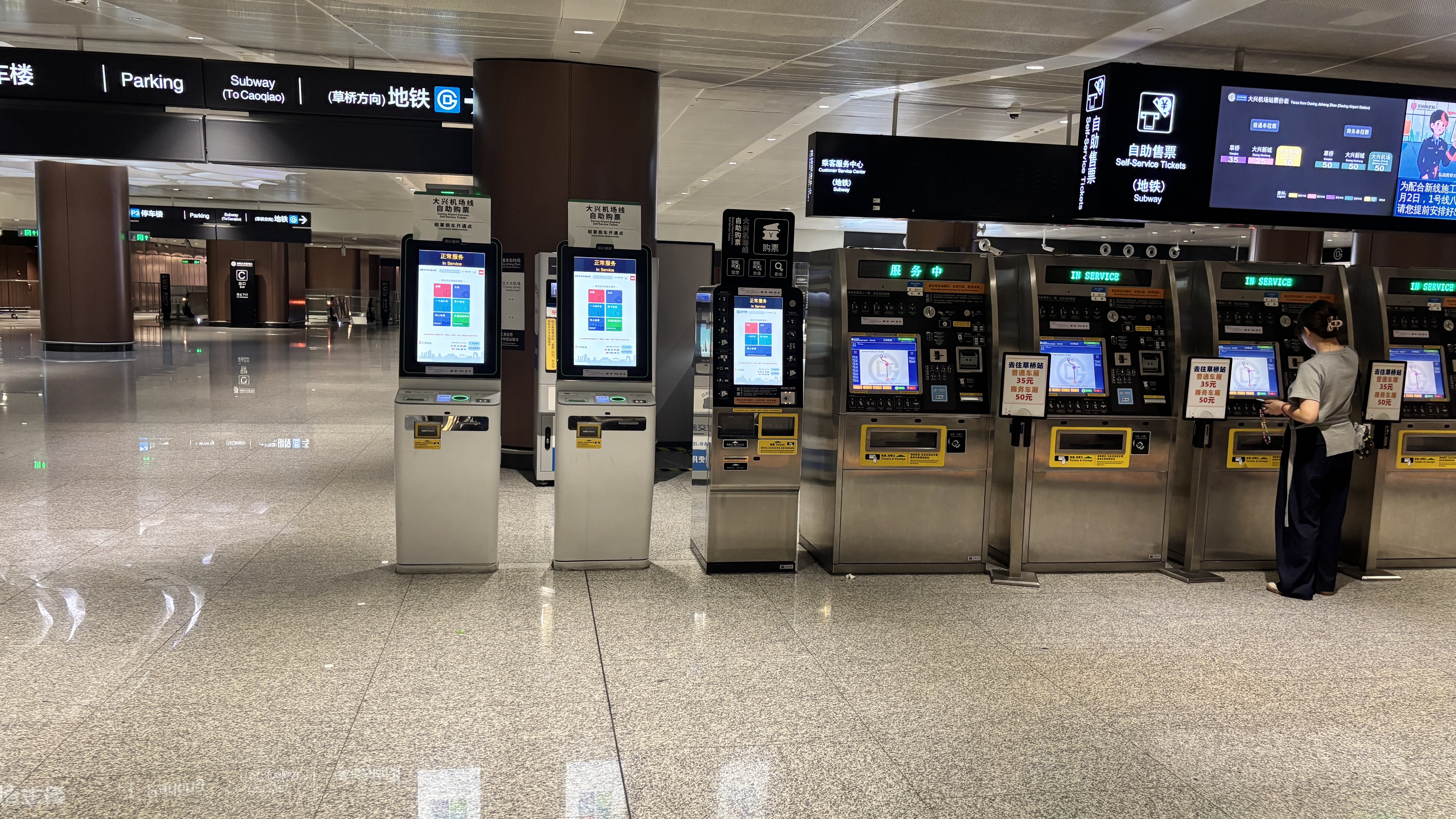 베이징 다싱 공항에서 시내까지 지하철로 이동할 수 있다. 베이징의 지하철은 매우 잘 되어 있고 요금도 저렴한 편이라 여행 경비를 아끼는 데 큰 도움이 된다. 공항에서 시내까지의 거리는 꽤 긴 편이나 지하철을 이용하면 20분에서 30분 사이에 베이징 시내 중심의 지하철 역까지 편하게 이용이 가능하다.